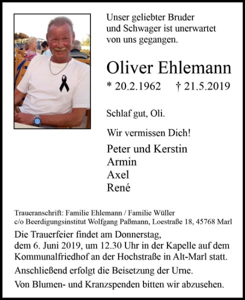 Es tut leid das wir heute nicht an der Beisetzung Teil nehmen konnten .Leider ist gestern oli.s freund Dieter auch verstorben .Im Stilen gedenken an beide .denis und. Karin